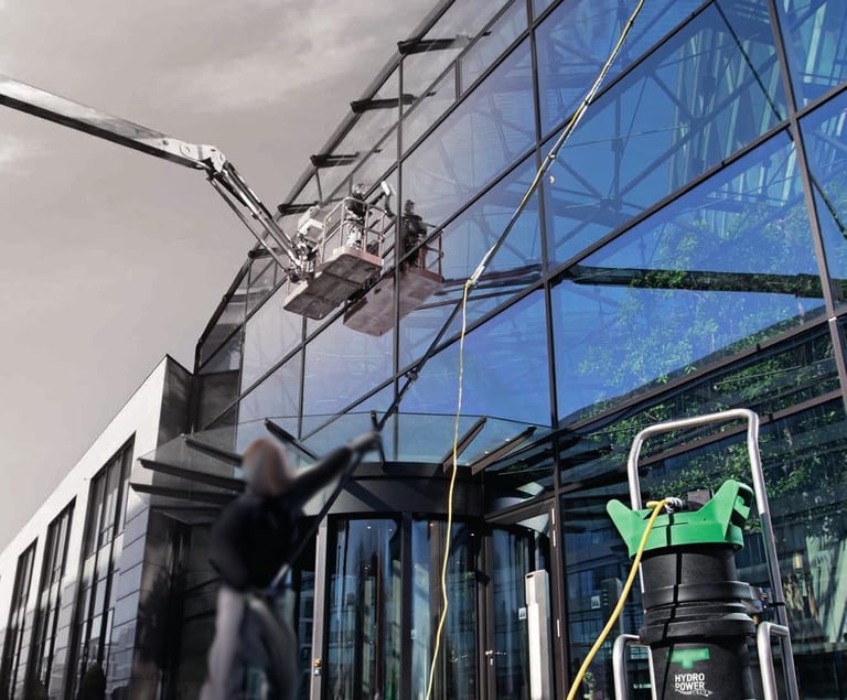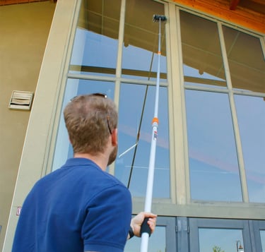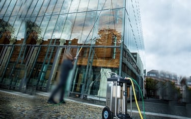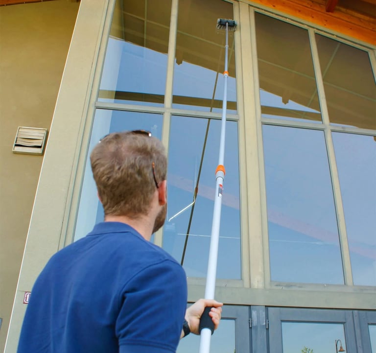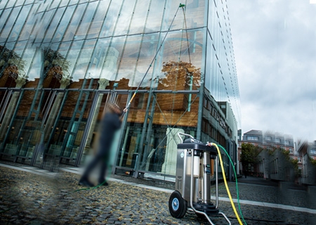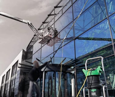 Pour la vitrerie haute ou difficilement accessible nous utilisons une machine à fabrication d'Eau pure nous permettant de travailler de plain-pied de manière sécurisée